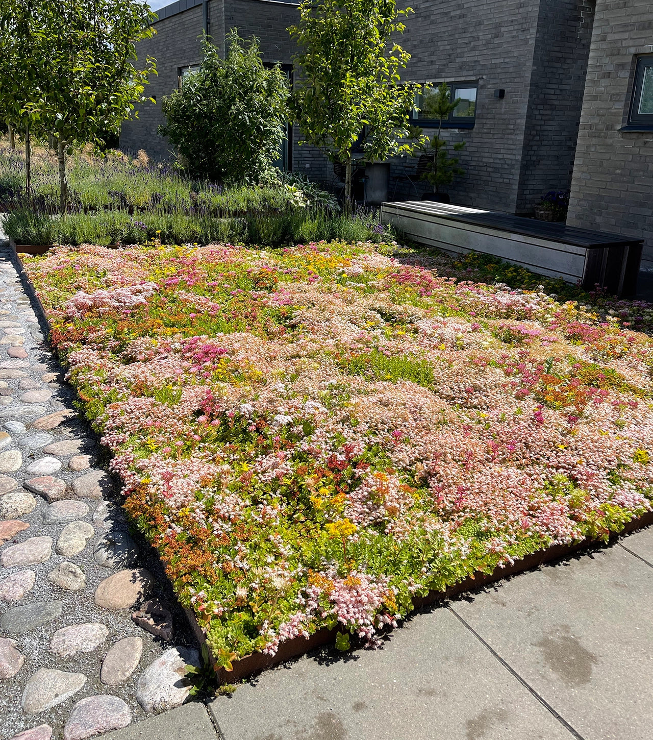 Sedum overlever frost ned til mange minusgrader og varmeperioder uden vanding. Plantens evne til at lagre vand i bladene gør løsningen stabil gennem hele året.