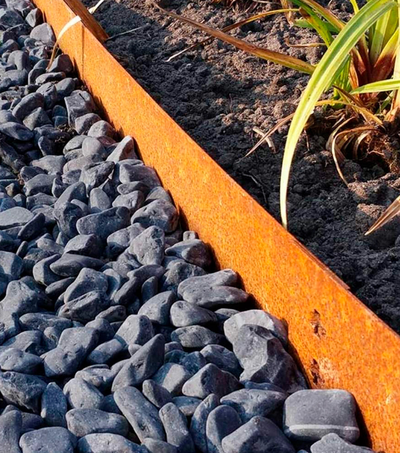 Bedkant i cortenstål med jordspyd for nem montage i haven.