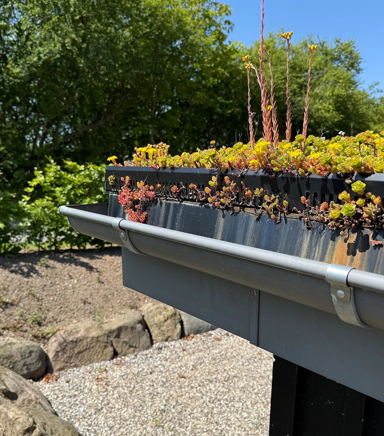 Kantskinnen sikrer en pæn og funktionel afslutning og forhindrer samtidig, at materialer som jord og småsten skylles ud over kanten. De præcist placerede drænhuller sørger for, at vandet hurtigt og kontrolleret kan ledes bort fra tagfladen og ned i tagrenden.