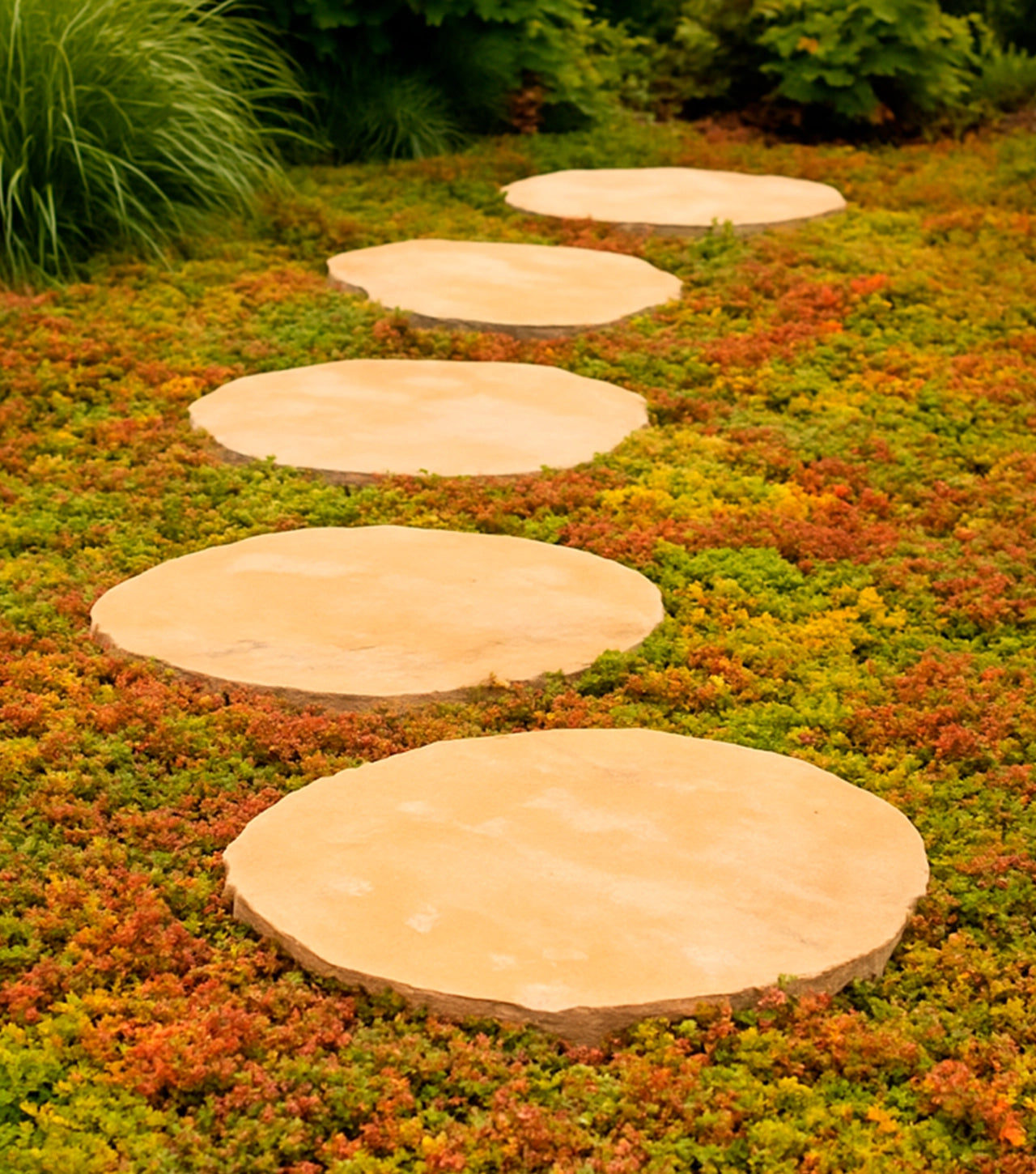 Trædestenene er lavet af robust sandsten, som giver både lang holdbarhed og en flot, naturlig overflade. Den gyldne tone tilfører haven et varmt og eksklusivt præg, perfekt til stier, gangarealer eller som dekorativt indslag i dit sedummåtte bed eller bunddække.